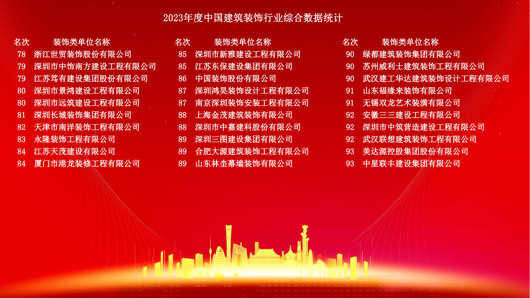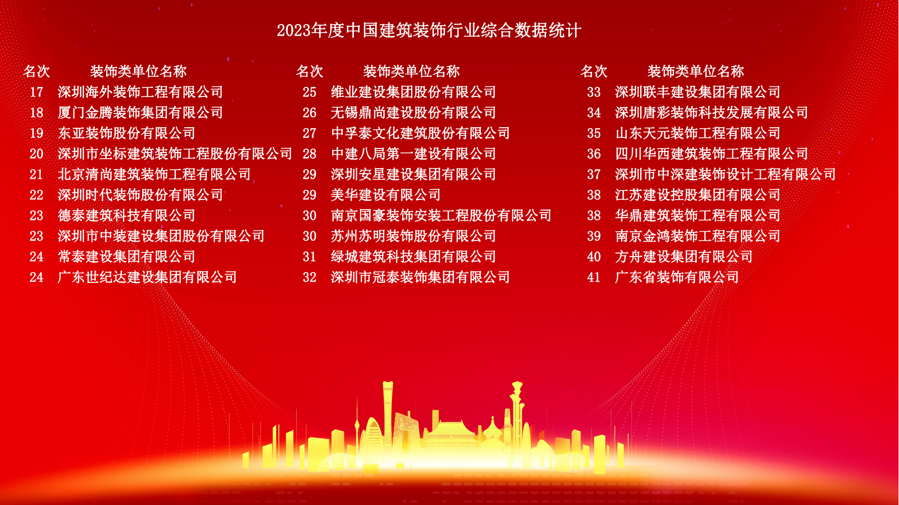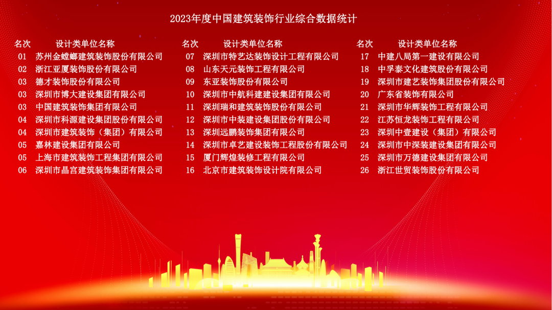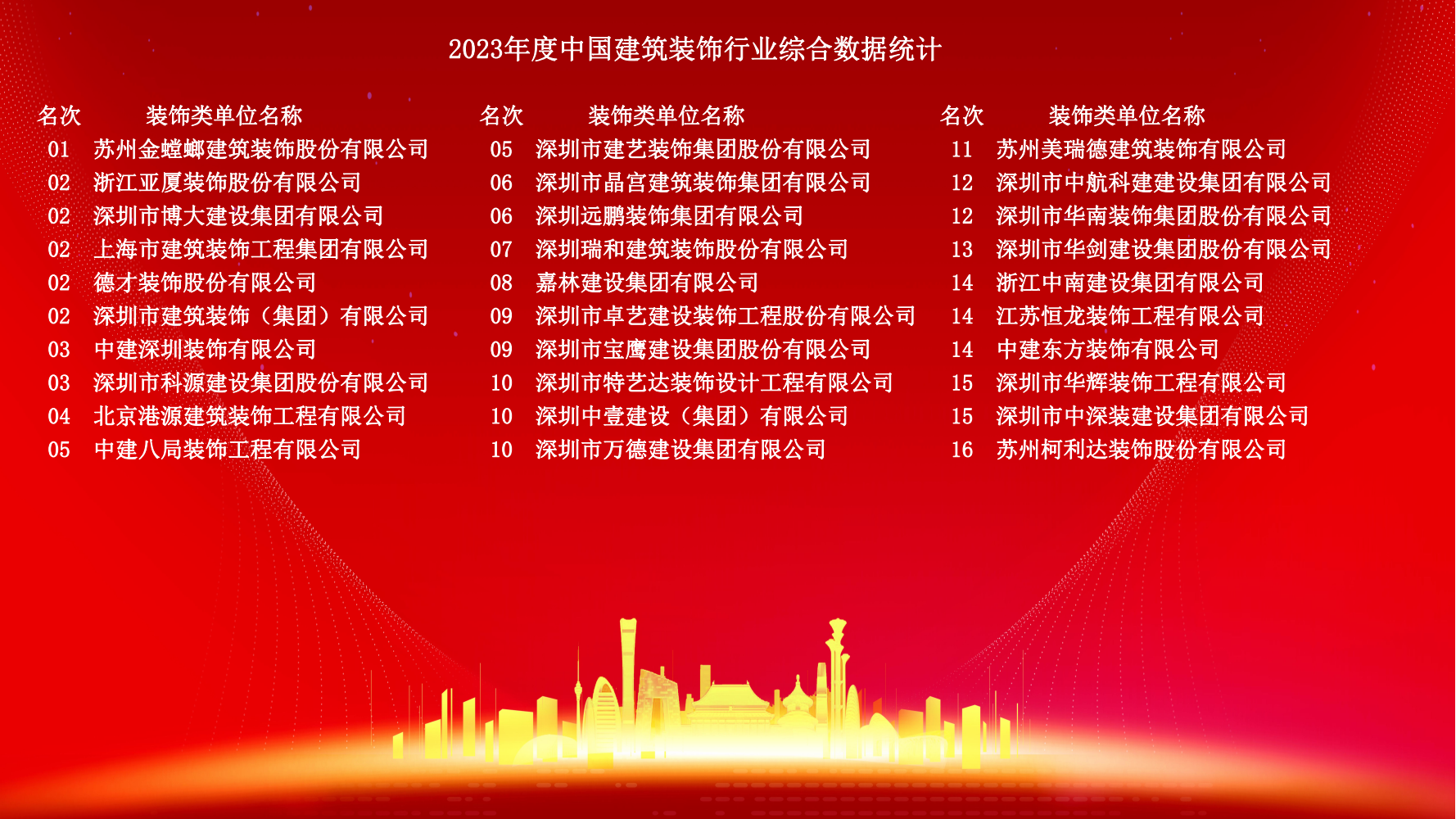 12月10日,2023年度中國建筑裝飾協(xié)會行業(yè)綜合數(shù)據(jù)統(tǒng)計正式發(fā)布。詳細(xì)名單如下: