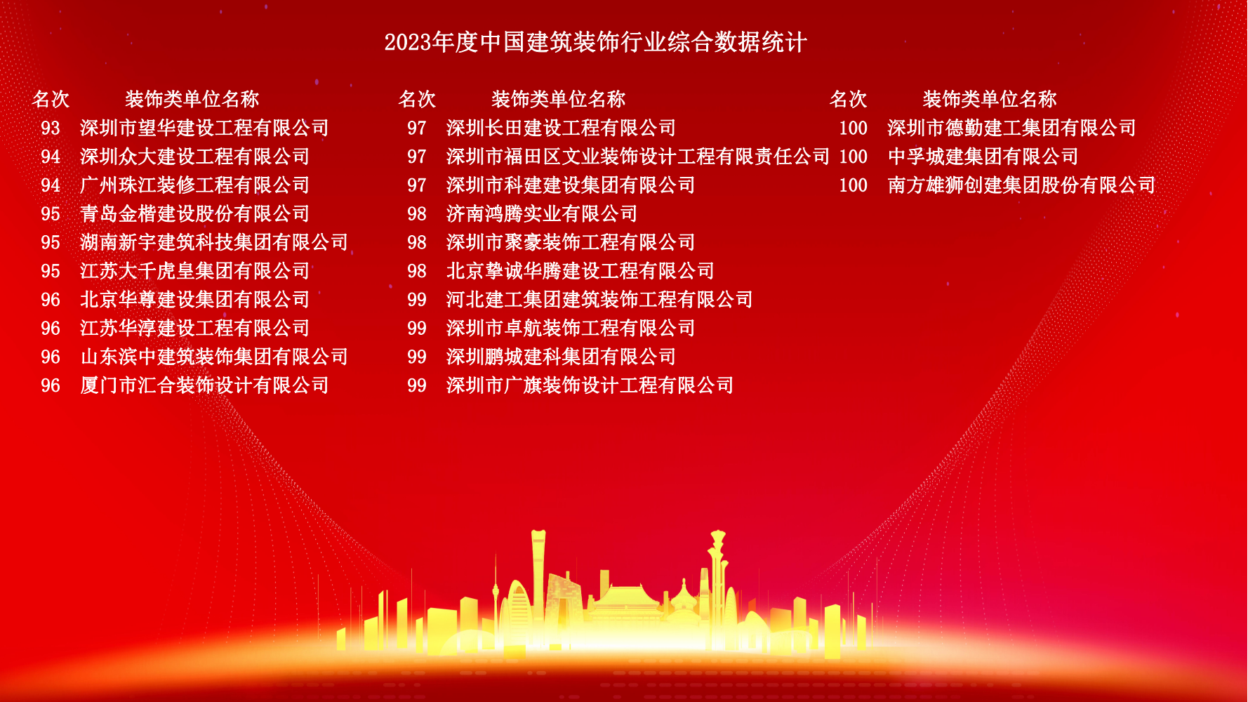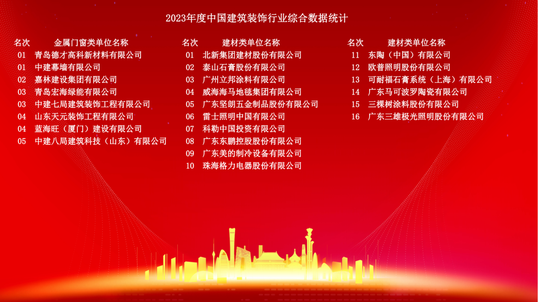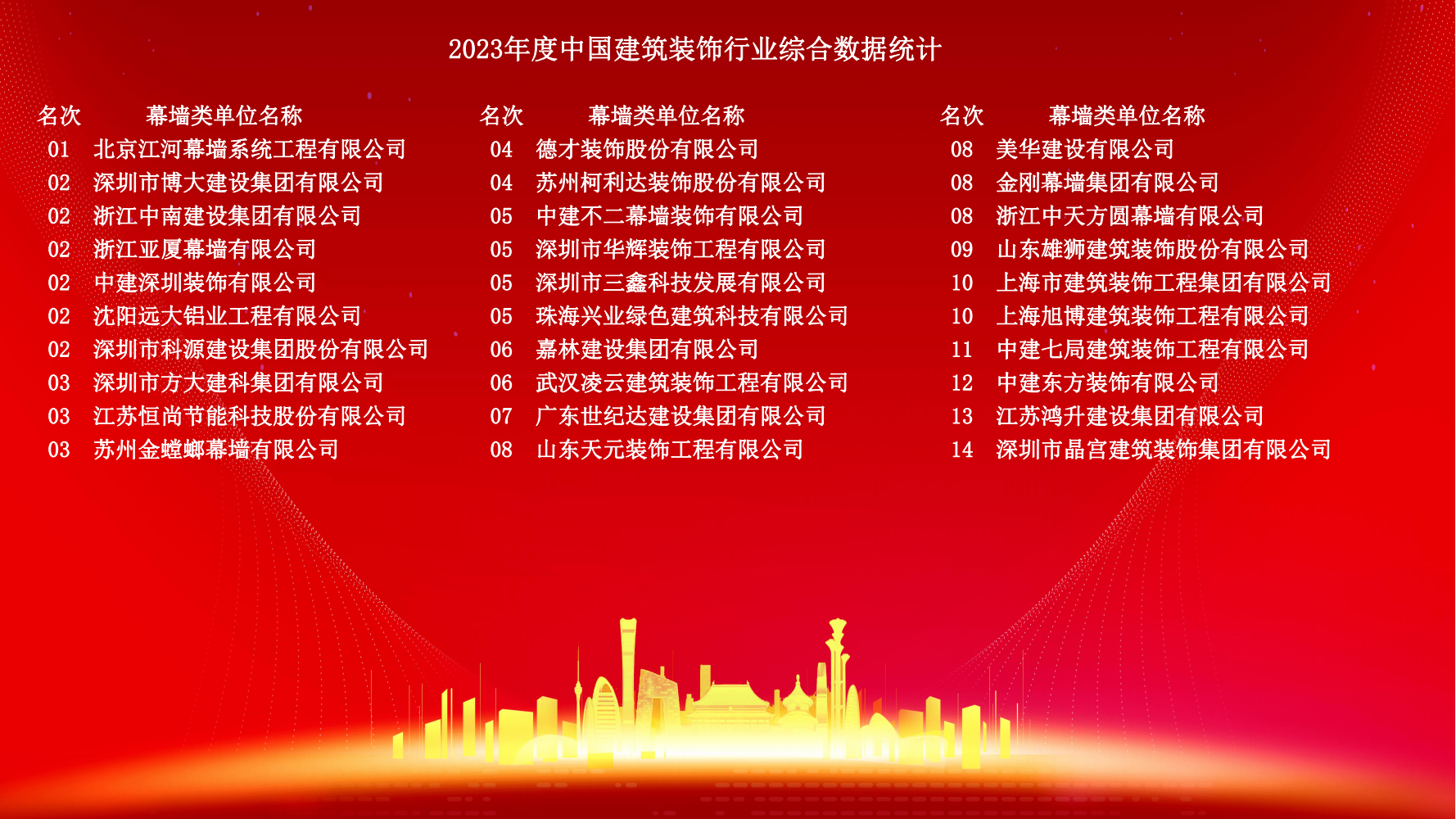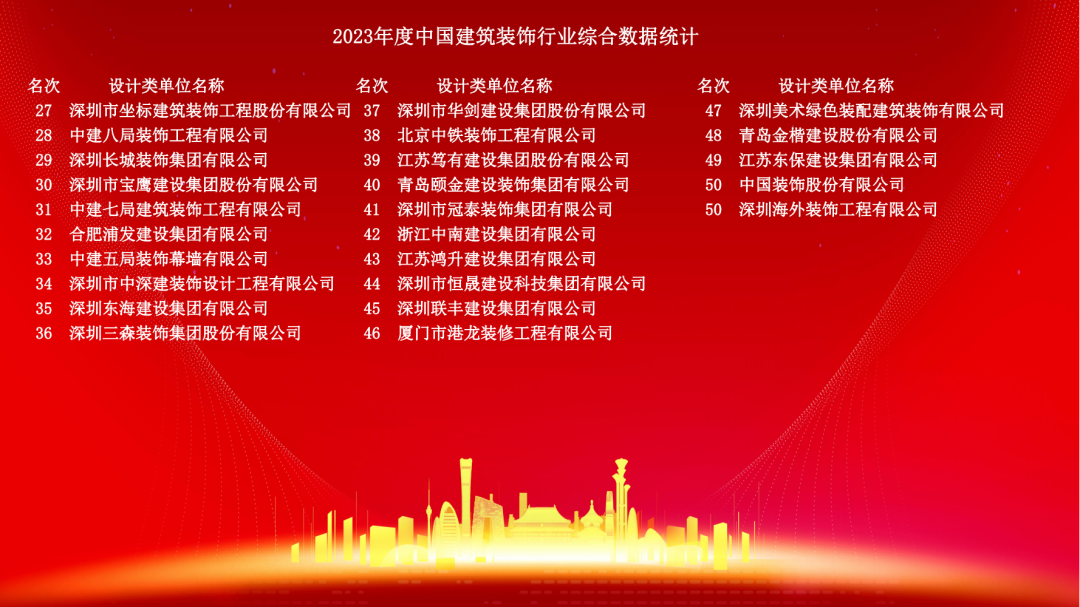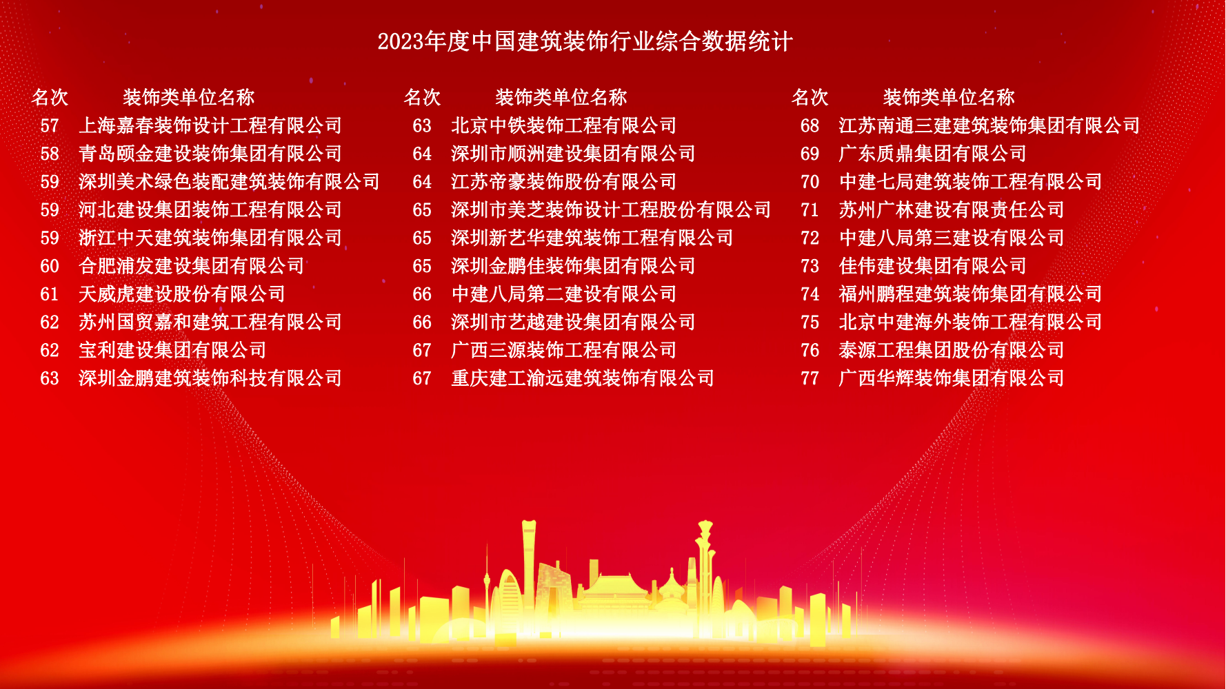 12月10日,2023年度中國建筑裝飾協(xié)會行業(yè)綜合數(shù)據(jù)統(tǒng)計正式發(fā)布。詳細(xì)名單如下: